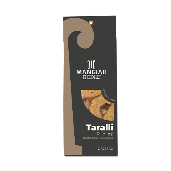 Taralli artigianali dalla tradizione pugliese, realizzati con farine da grani selezionati, olio extravergine d’oliva e un raffinato vino bianco aromatico. Questi taralli si distinguono per la loro fragranza, il gusto equilibrato e la croccantezza irresistibile. Perfetti da gustare da soli o in abbinamento a salumi, formaggi e vini.